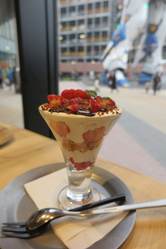 とりあえず甘いものをと思って頼んだパフェが「映える」のでびっくりしました。イチゴパフェは側面までかわいい。
