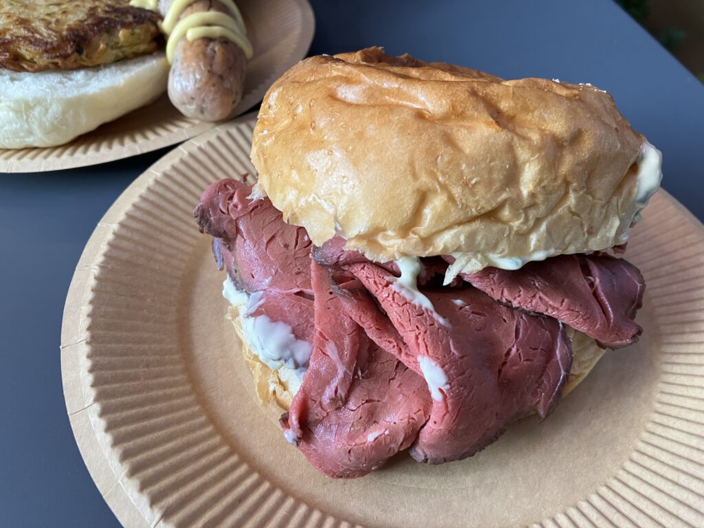 夕食の時間だったのでローストビーフのブリオッシュをいただきました。ビーフが柔らかくてがおいしくて、タルタルソースも酸味ありのさっぱりしたもので特に気に入りました。これはまた食べたいなあ。というか月一ぐらいで食べたい。写真奥のソーセージ&ポテトフリッターもボリューム満点で満足でした。
