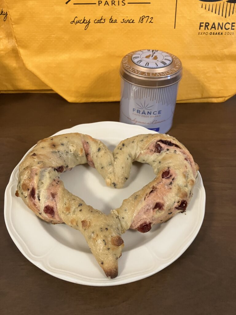 先日まで販売されていた万博限定パン、クールロゼ。ハート型のハードなパンに、ストロベリーフレーバーの茶葉とホワイトチョコレートが練り込まれています。