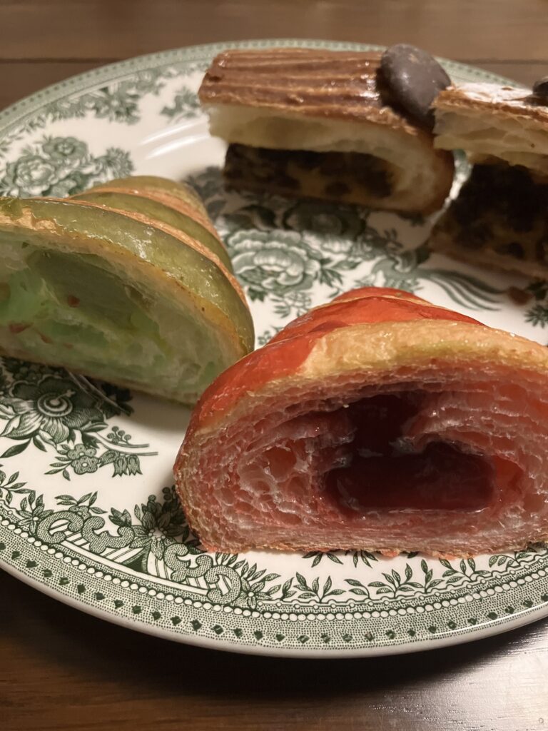 断面はこんな感じ。クロワッサンルージュはラズベリーの酸味が強め。クロワッサン抹茶の緑の鮮やかさにちょっとびびる。味はおいしかったです。パンスイスはチョコレートがビターで、香りも良し。一番食べたかったパンなので大満足です。