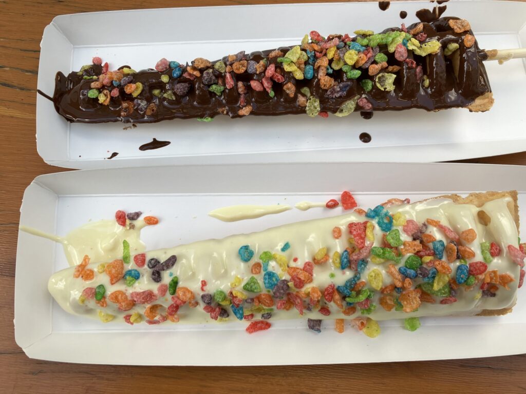 ツリーワッフルなるものがあったので挑戦。チョコレートとホワイトチョコレートのディップ。カラフルなトッピングはおそらくコーンフレークだと思います。サクサクした食感が珍しく、見た目も楽しくいただくことができました。