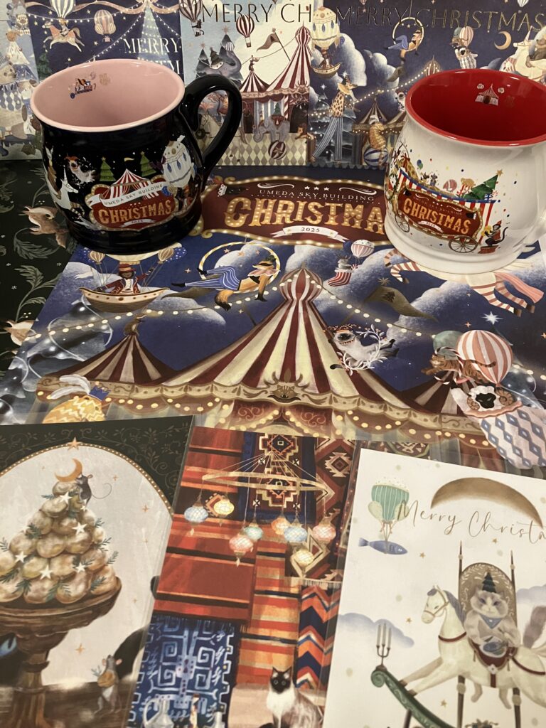 立てかけてあるポストカードと、マグカップはスカイビルのグッズ。手前のポストカードは個展で購入しました。