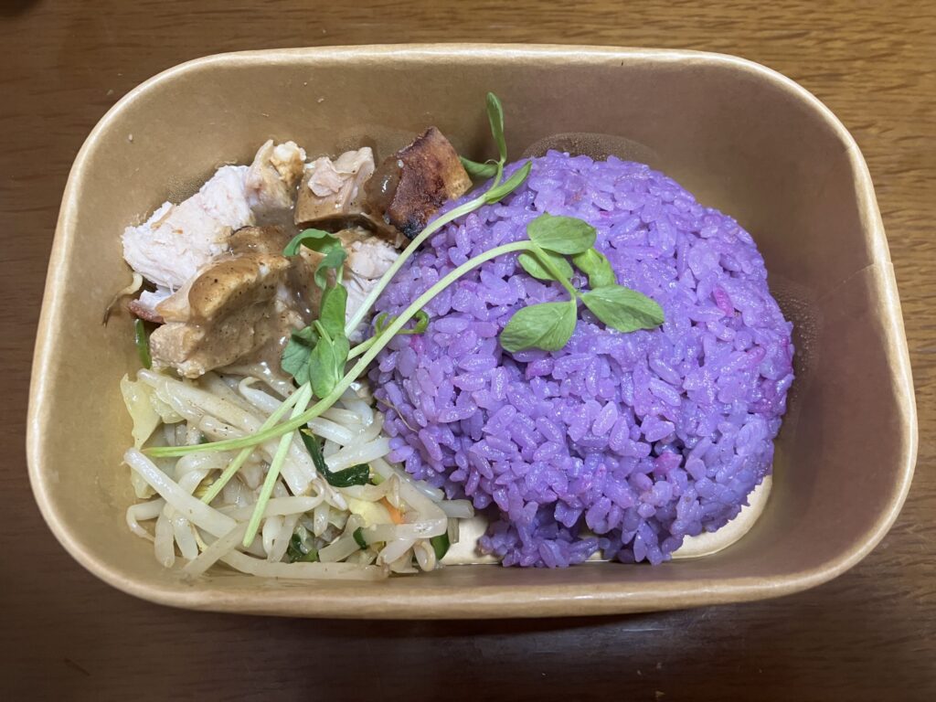 付け合わせの野菜はチリソースで和えてもの。紫芋と炊いたご飯の、鮮やかな色が目を惹きます。味は案外普通のご飯で、うっすら芋の甘みがある感じ。