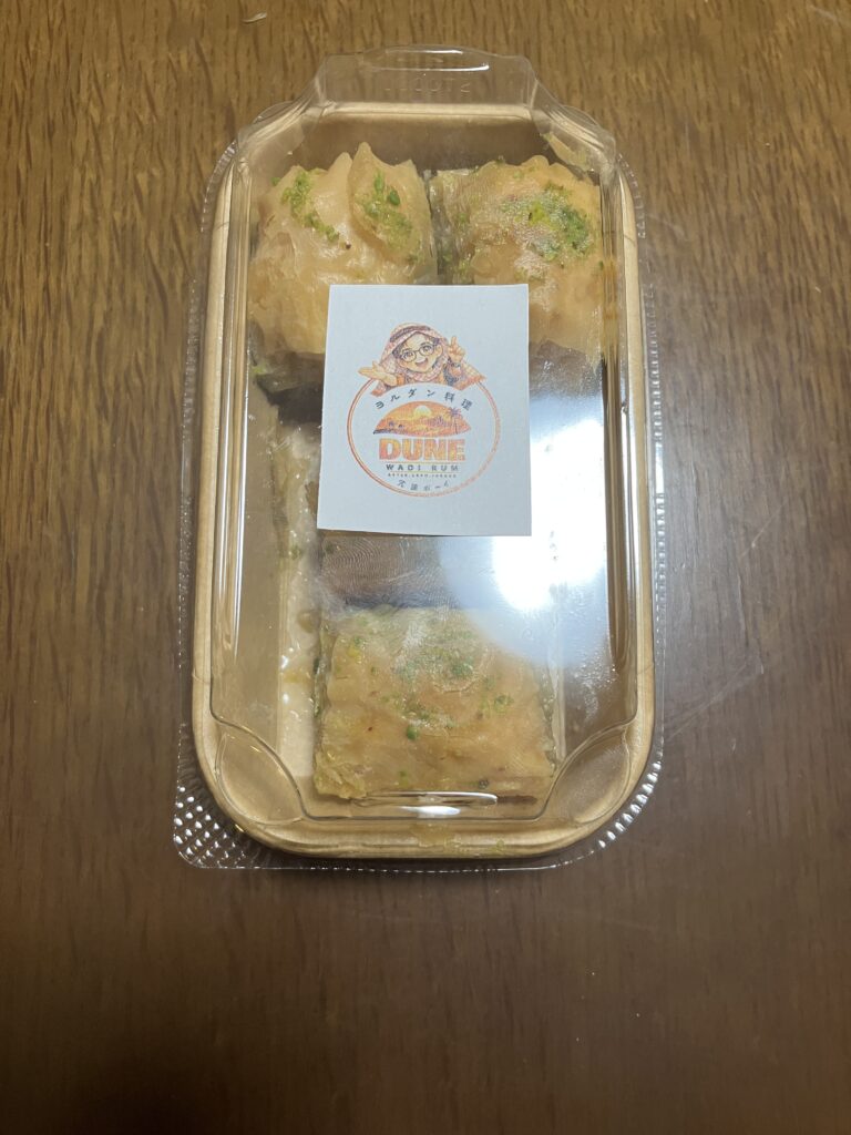 ヨルダンのバクラヴァを購入。3個入りからあり、私は4個入りを購入。