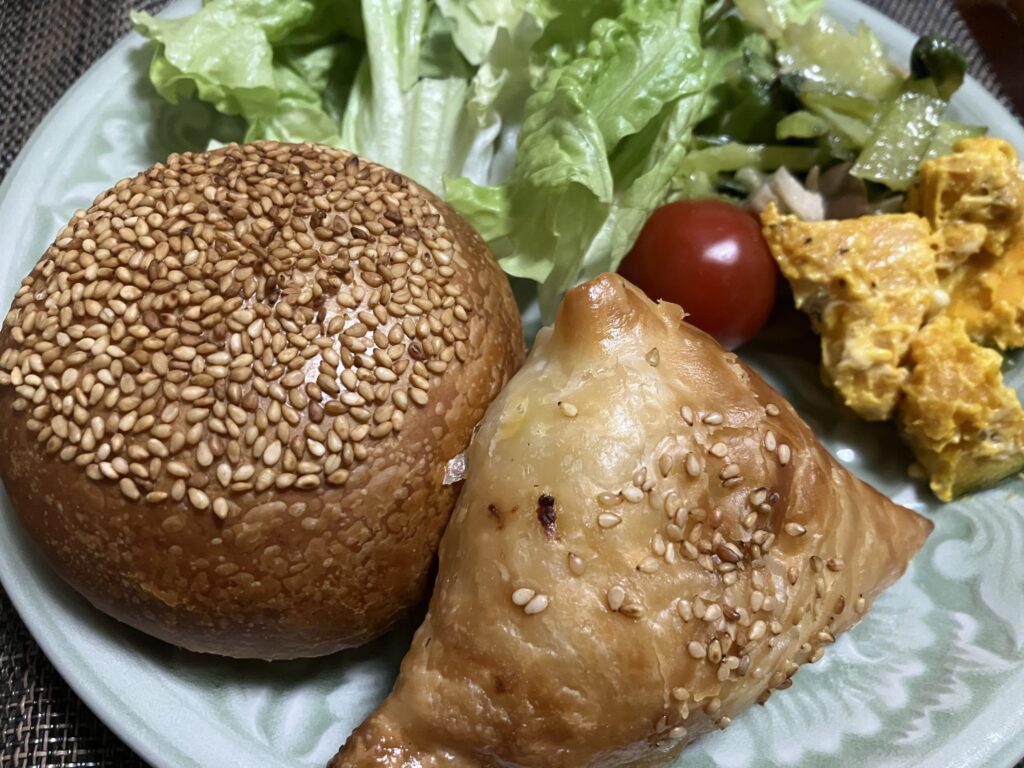 夕食にサムサを食べるとして、足りないなあと買い足しました。というのも、小麦生地にスパイスの効いた肉、表面に胡麻となると構成要素が同じ! と気がつき、食べ比べてみたくなったからです。
